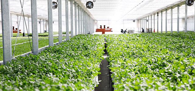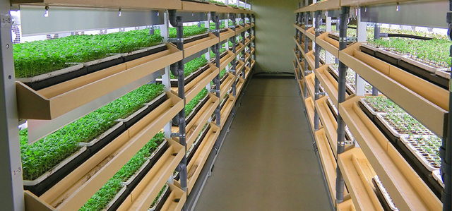 閉鎖環境において、太陽光を用いずに、人工光、空調設備、培養液の制御が可能な水耕栽培等により、より計画的な周年生産を行なう栽培システムです。