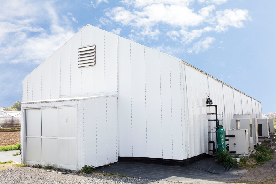 農業用ハウスを利用した完全人工光型植物工場です。