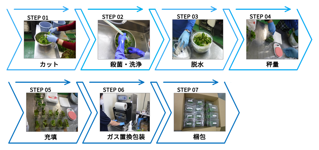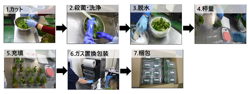 検査対象のレタスをカット、殺菌・洗浄(1回)、脱水後、秤量・充填し、ガス置換包装をして検体を作成。包装後の検体は、5℃設定にて冷蔵保存。