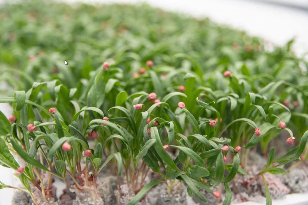 育苗トレイ(144穴)にロックウール粒状綿を主成分とする専用培地を充填し、プレス板で播種穴をつける。播種板により、1セル当り4~5粒播種する。覆土後、1トレイ当り300ml~400mlかん水し、発芽室(20℃設定)で発芽させる(3~4日)。